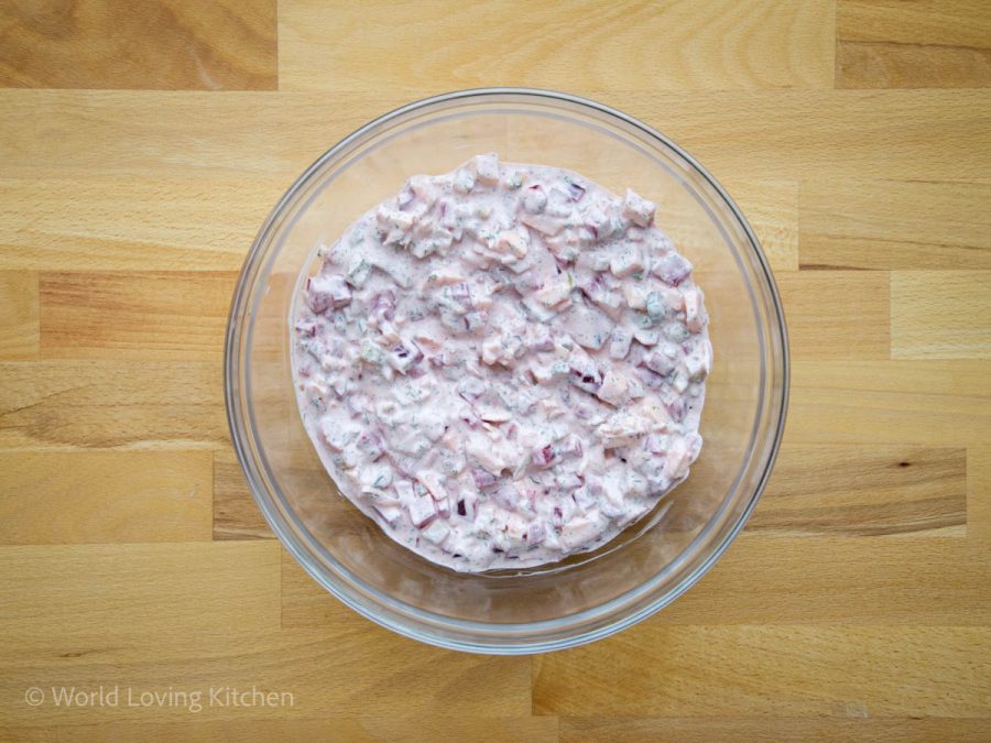 3. Vermengen & durchziehen lassen: Dressing über die vorbereiteten Zutaten geben. Optional jetzt etwas Rote-Bete-Saft hinzuzufügen, um die Farbe zu intensivieren. Alles gut vermengen und den Salat mindestens 2 Stunden im Kühlschrank ziehen lassen – idealerweise länger, damit sich die Aromen voll entfalten.