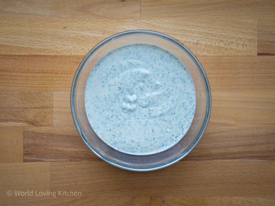 - Dressing anrühren: In einer separaten Schüssel saure Sahne, Schmand, Essig, Gewürzgurkenwasser und Senf verrühren. Mit Salz, Pfeffer und einer Prise Zucker abschmecken und den fein gehackten Dill unterrühren.